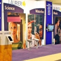 Stevens E3 developed a design with state-of-the art touch screens and ipads generously dispersed throughout the booth space to maximize interaction and data collection. The central section provided instant identification from all areas of the exhibit hall, using a 3-tiered Tension Fabric header with high impact branding. The Wilfrid Laurier name was a focal point of the exhibit. This area of the booth provided a large open space to offer general information and direction of the traffic to appropriate people to talk to. The faculty areas opened up to the left and right of the - clearly identifying the multi-campus environment and program identification. A "fun area" adjacent to the main area created excitement and activity reflecting the community atmosphere at Laurier - bringing the "feel" of the campus to the show floor. Conversation was encouraged throughout the booth space - supported by the availability of view books close at hand - from 6 large free standing kiosks - at any one time 5,000 view books were just steps away.